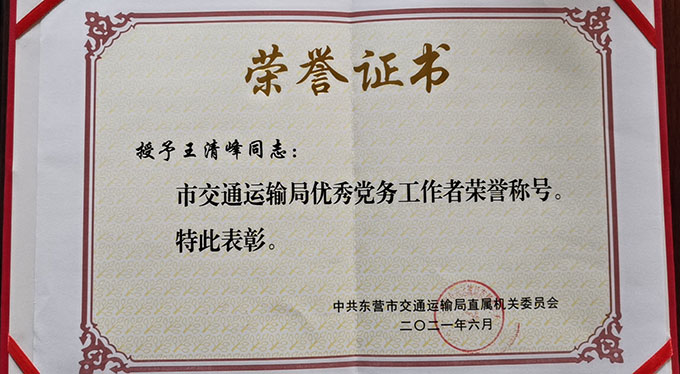 王清峰榮獲“市交通運輸局優秀黨務工作者”