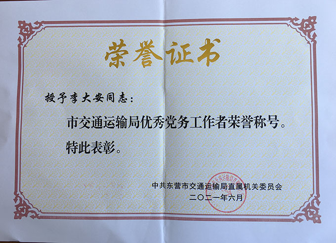 李大安榮獲“市交通運輸局優秀黨務工作者”